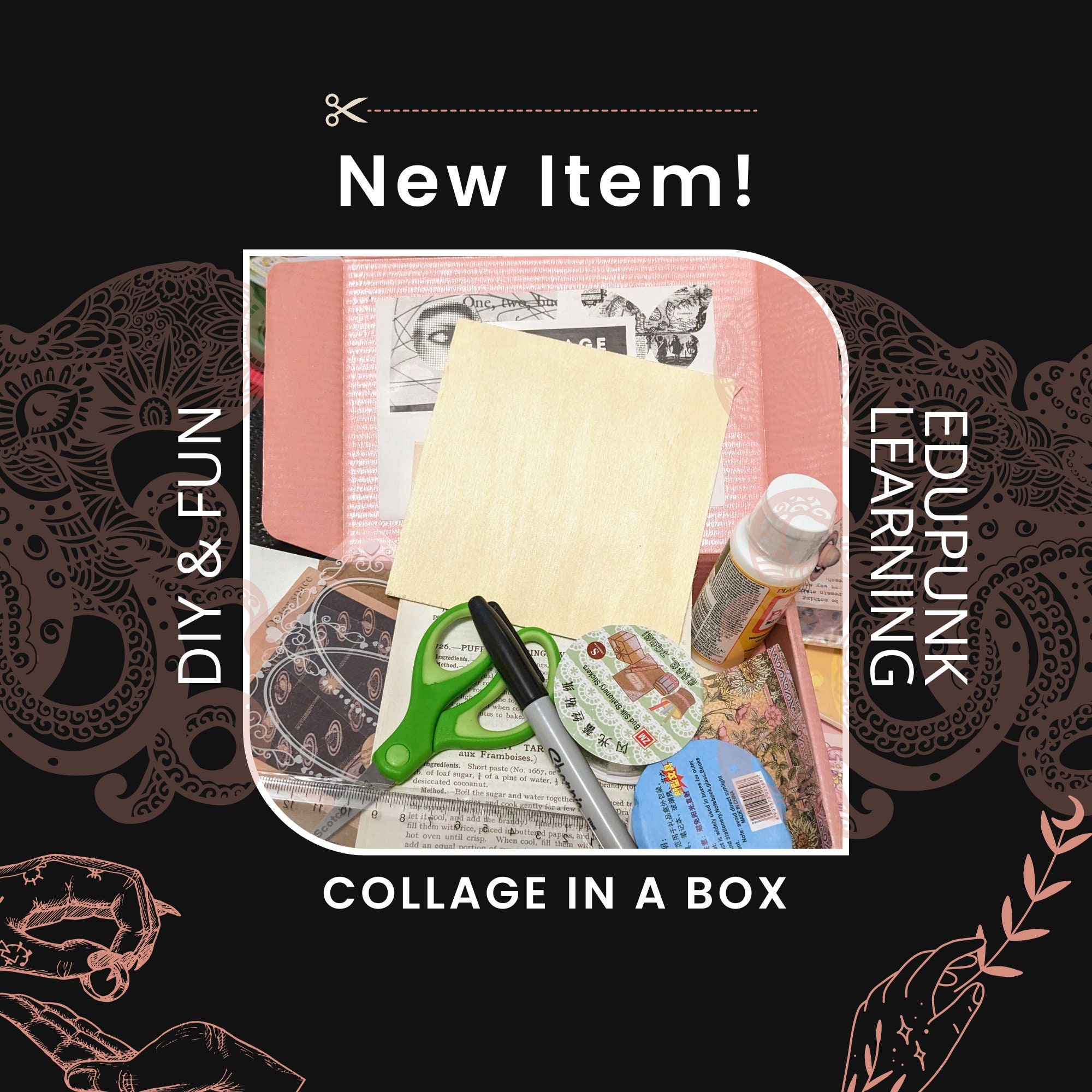 This listing is for the general-themed box. Our other edupunk collage kits include forest, fairies & faes & celestial.